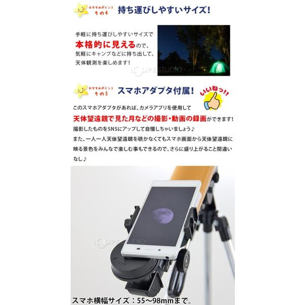 安心の日本製です!レンズメーカー池田レンズ工業が本気で作った入門天体望遠鏡!初めて買うならこれ!初心者の方でも扱いやすい本格的な望遠鏡です!スマホ撮影用アダプター付き!素通しファインダー(のぞき穴ファインダー)式なので面倒なファインダーあわせが不要!【スマホ横幅サイズ:55〜98mmまで対応】