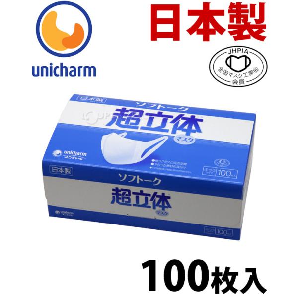 安心の日本製使い捨てマスク!ユニ・チャームソフトーク超立体マスクふつうサイズ100枚入(業務用)です。二つ折り時サイズ:縦135×横158(mm)