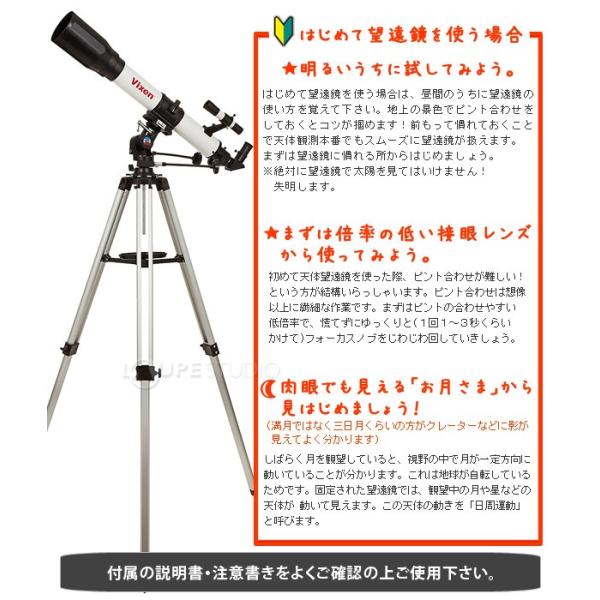 ◯鏡筒部: 対物レンズ有効径 70mm/アクロマート 焦点距離(口径比F) 700mm(F10) 分解能/極限等級 1.66秒/11.0等星 集光力 肉眼の100倍 ファインダー 6倍24mm