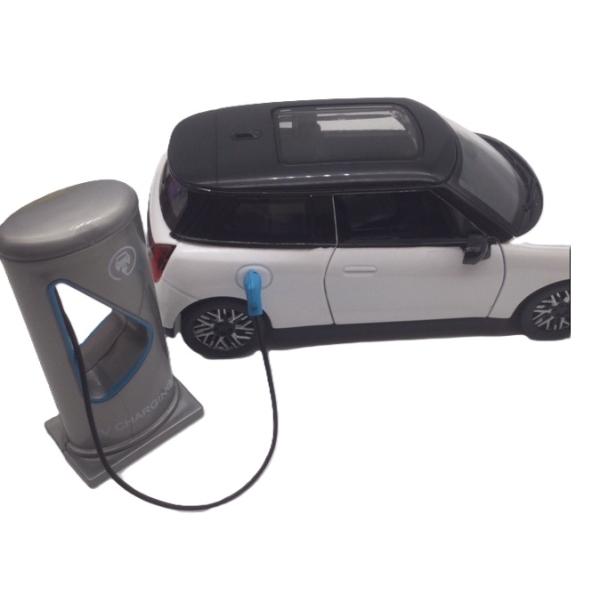 ミニカー 白 1/28 ミニクーパー SE EV 充電スタンド付き ヘッドライト&テールライト点灯 走行音&ドアロック音 新品 プルバック 電気自動車 光る鳴る