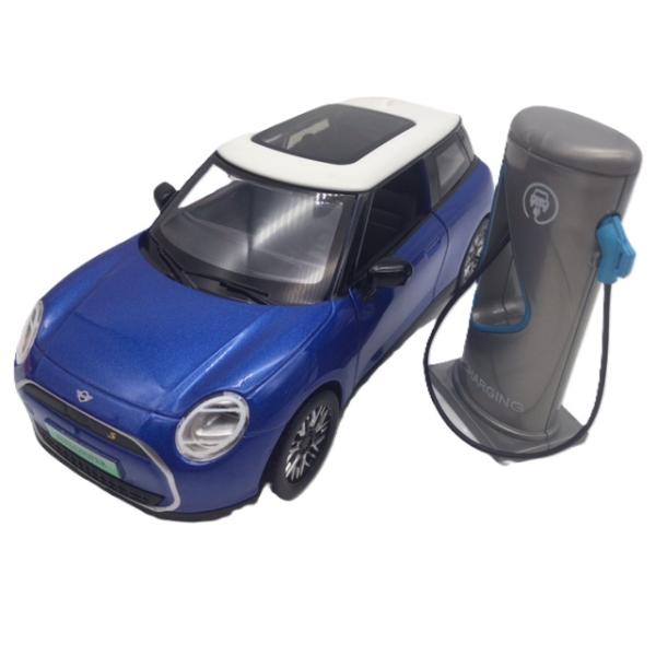 ミニカー メタリックブルー 1/28 ミニクーパー SE EV 充電スタンド付 ヘッドライト&テールライト点灯 走行音&ドアロック音 プルバック 電気自動車 光る鳴る