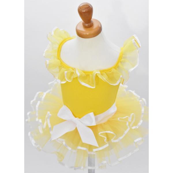 キャンディのようなポップなお色に白いリボンがアクセントのバレエチュチュです。コットンレオタードに張りのあるチュールが3段付いた可愛らしい衣装です。