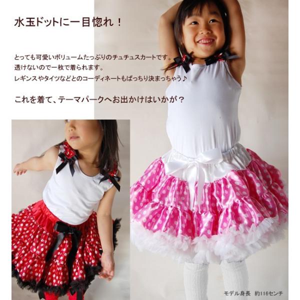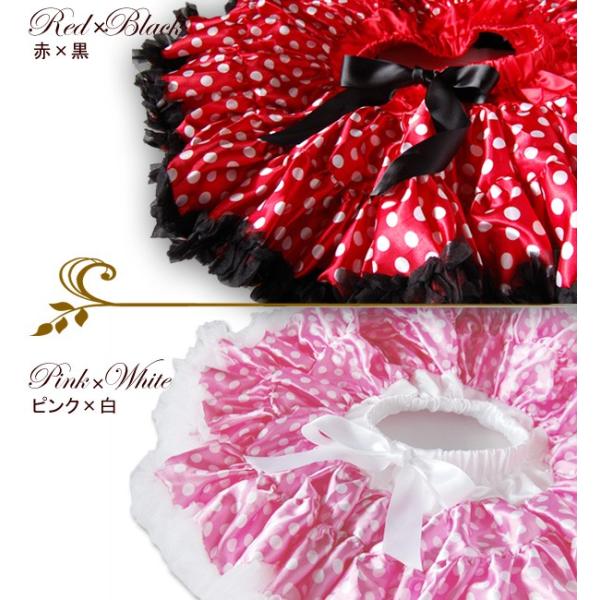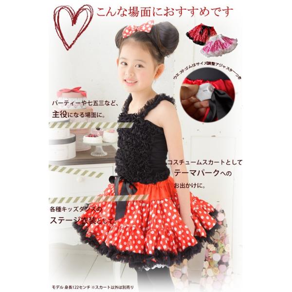 水玉が可愛いチュチュスカートです。水玉ドットのサテン生地スカートの下にギャザーたっぷりのやわらかいチュールパニエが内蔵。ウエストは総ゴムでアジャスターつき。メーカー表示サイズはL(110)ですが丈が合えば幅広い年齢の方にご着用いただけます。