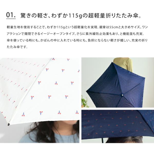 驚きの軽さ、わずか約115gの超軽量折りたたみ傘。親骨は55cmと大きめサイズ、ワンアクションで開閉できるイージーオープンタイプ、さらに紫外線防止効果もありと機能面も充実。傘を使っている時にも、かばんの中に入れている時にも、負担にならない軽さが嬉しい、充実の折りたたみ傘です。