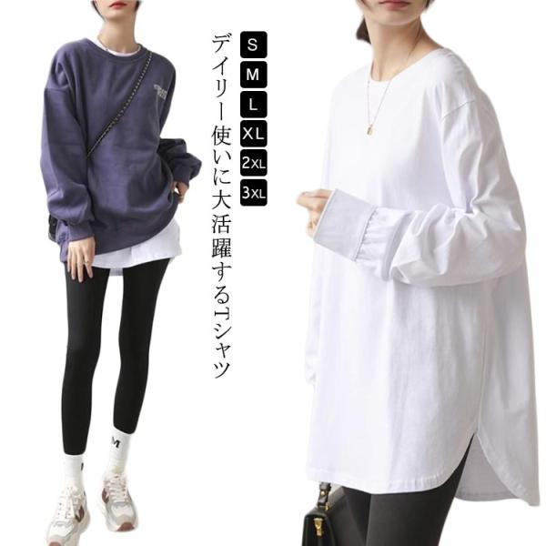 長袖 tシャツ カットソー クルーネック チュニック丈 ロンt レディース 長袖tシャツ サイドスリット ラウンドカット レイヤード 重ね着 ロングt