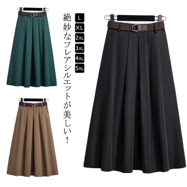ブラック 春 Aラインスカート オフィスカジュアル 黒 スカート フレアスカート ベルト付き 上品 ロング 秋 膝下 ロングスカート ミモレ丈スカート