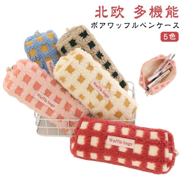 ボアワッフルペンケース ブラシケース 可愛い 高校生 女子 文具 中学生 チェック柄 大容量 おしゃれ シンプル 大人 大学生 スリムポーチ 入学 中