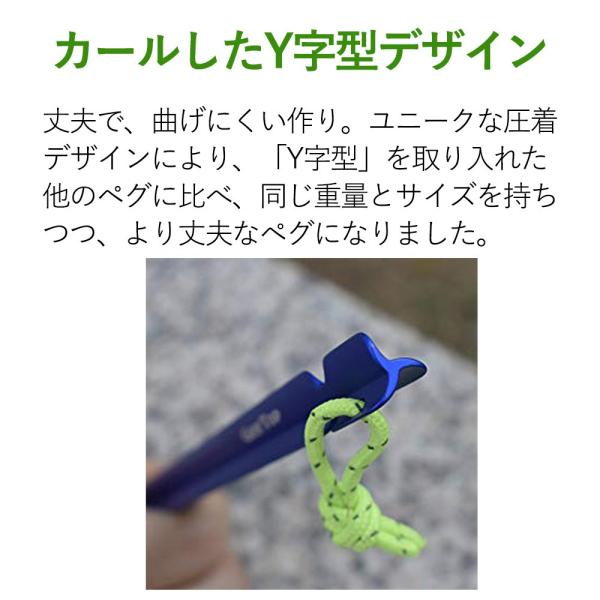 ユニークな圧着デザインにより、「Y字型」を取り入れた他のペグに比べ、同じ重量とサイズを持ちつつ、より丈夫なペグになりました。