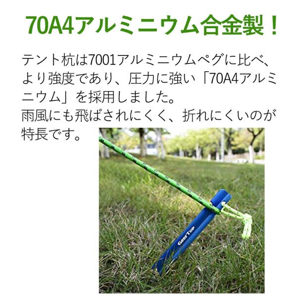 テント杭は7001アルミニウムペグに比べ、より強度であり、圧力に強い「70A4アルミニウム」を採用しました。