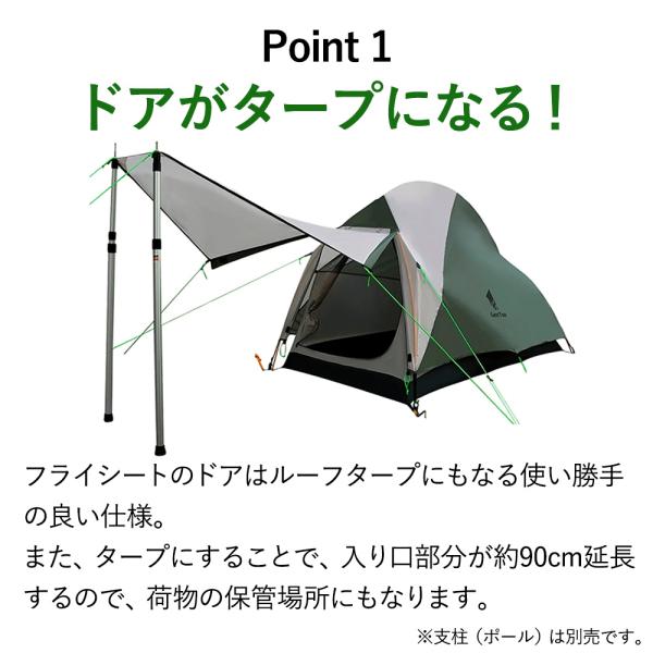 フライシートのドアがタープにもなる、使い勝手の良いテント
