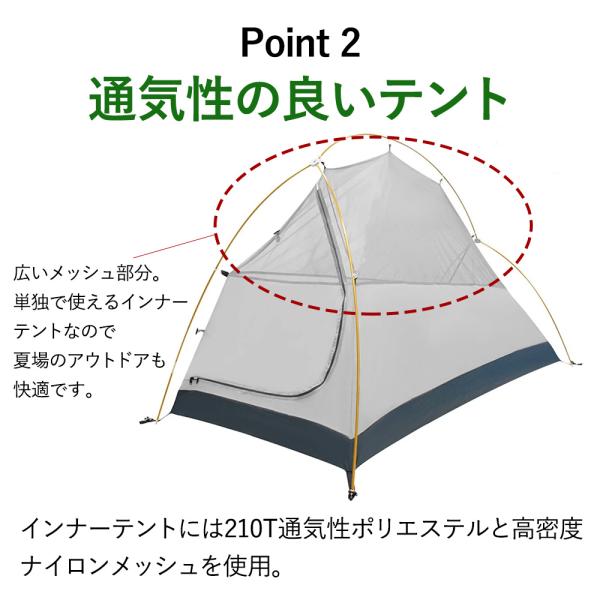 インナーテントには210T通気性ポリエステルと高密度ナイロンメッシュを使用。