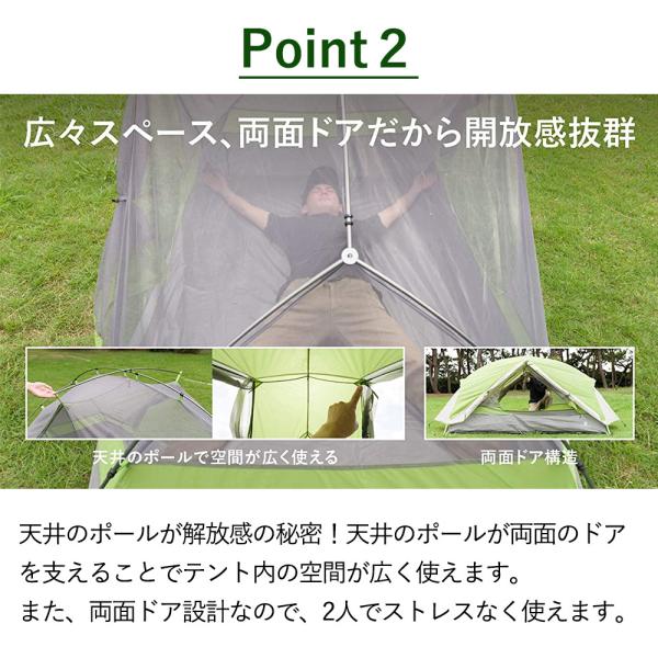 天井のポールが両面のドアを支えることでテント内の空間が広く使えます。