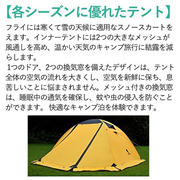 インナーテントには2つの大きなメッシュが風通しを高め、温かい天気のキャンプ旅行に結露を減らします。