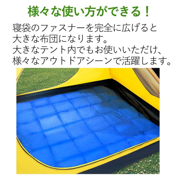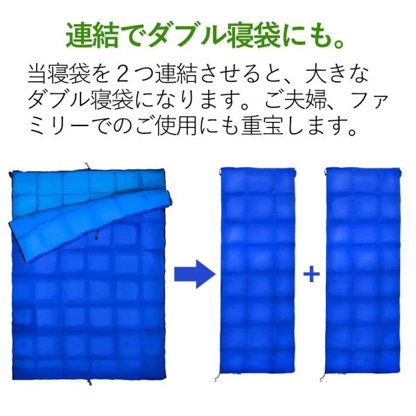 当寝袋を2つ連結させると、大きなダブル寝袋になります。ご夫婦、ファミリーでのご使用にも重宝します。