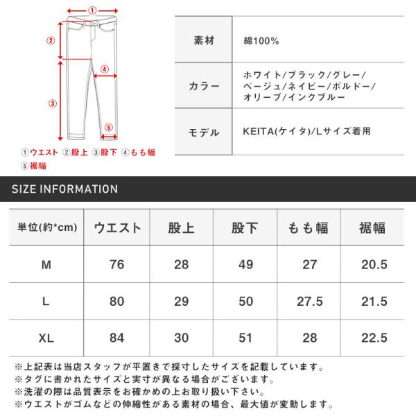ウエスト約76cm/股上約28cm/股下約49cm/もも幅約27cm/裾幅約20.5cm