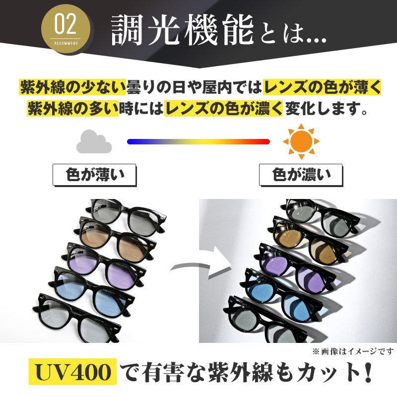 調光レンズは紫外線の量によって色が変化するので掛けっ放しでも過ごしやすい!