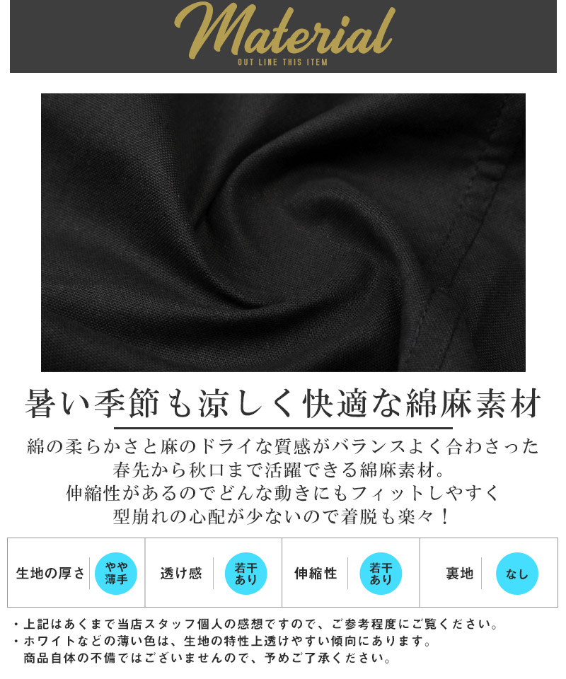 綿麻ならではの柔らかな質感とドライな肌触りで、清涼感のあるスタイリングにピッタリの一着。