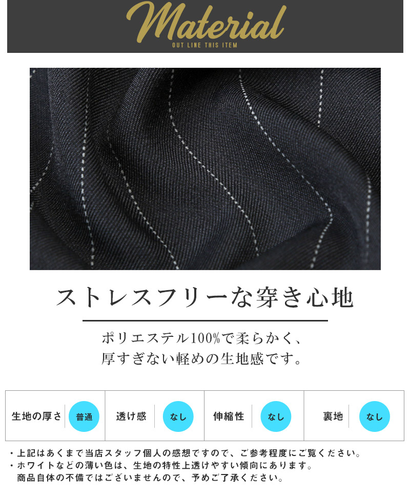 軽やかでハリのあるストライプ生地をを使用し、柔らかくストレスの無い穿き心地。