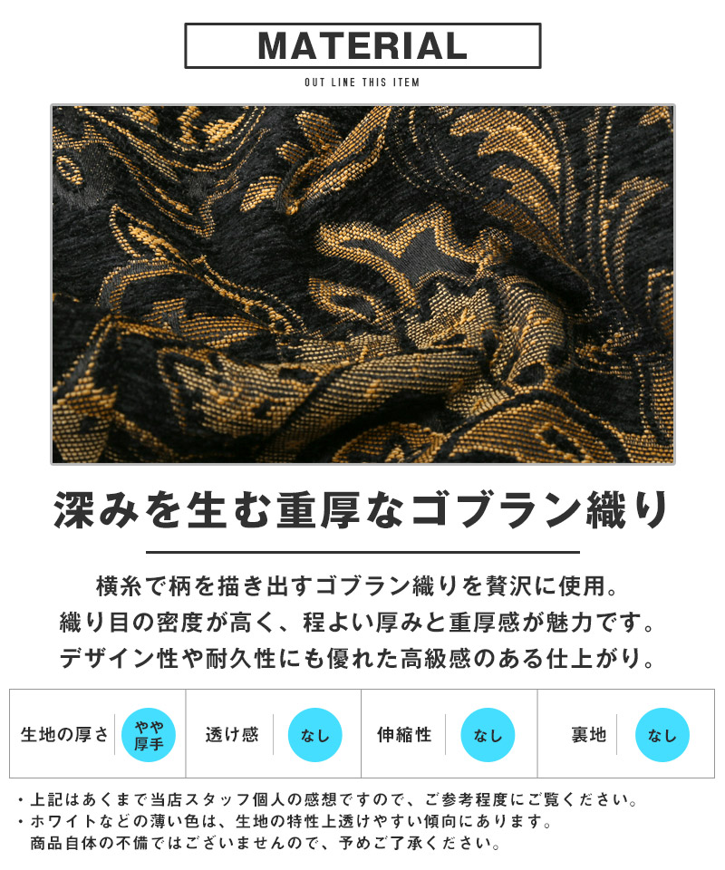 ゴブラン織りの密度のある織り地で表現された立体感が奥行きを生み、落ち着いた華やかさを演出。