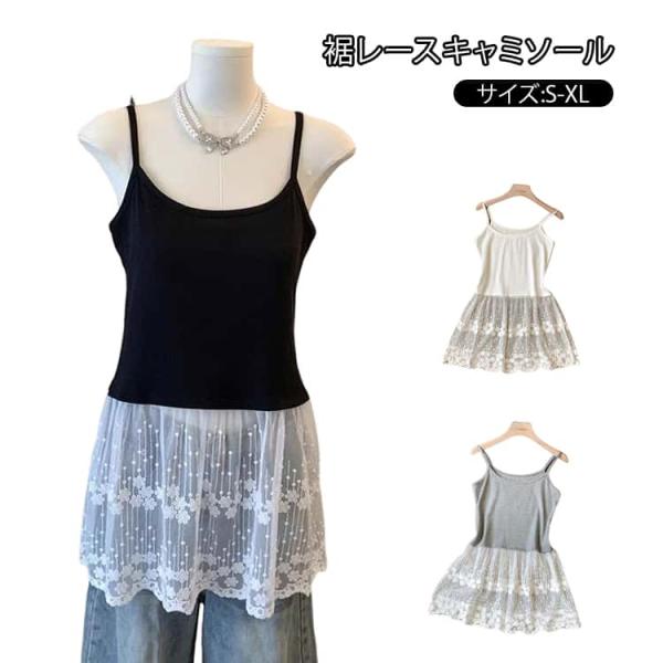 インナー レディース お尻が隠れる キャミソール キャミソール 裾レース ノースリーブ レイヤード風 トップス つけ裾 無地 レース切り替え キャミ