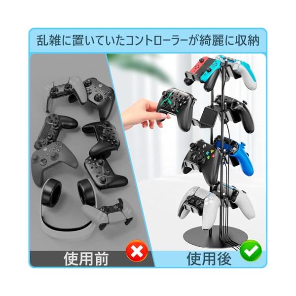 ・幅広い互換性ゲームコントローラー収納ラックは、PS5 Pro / PS5 Slim / PS5 / PS4 / PS3 / PS2 / Xbox One / Xbox Series X / S / Xbox 360コントローラーおよびSwitch Proコントローラーに適用し、最大8つまで収納できます。ヘッドホンも収納できます。