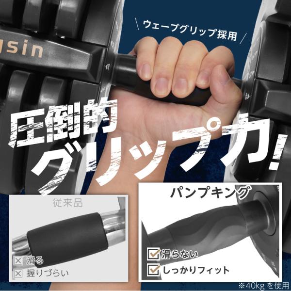 【仕様】 ウェーブグリップ 見やすいメモリ 高重量 耐久 片手式 秒速重量切替 可変式 15段階 17段階 調節可能 アジャスタブル ダンベル 転がり防止 省スペース 組立不要