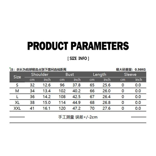 カラー:ブラック/グレー/カーキ素材:ポリエステルサイズ: 肩幅 胸囲 着丈S 32cm 96cm 65cmM 34cm 102cm 66cmL 36cm 108cm 67cmXl 38cm 114cm 68cmXxl 41cm 120cm 70cm