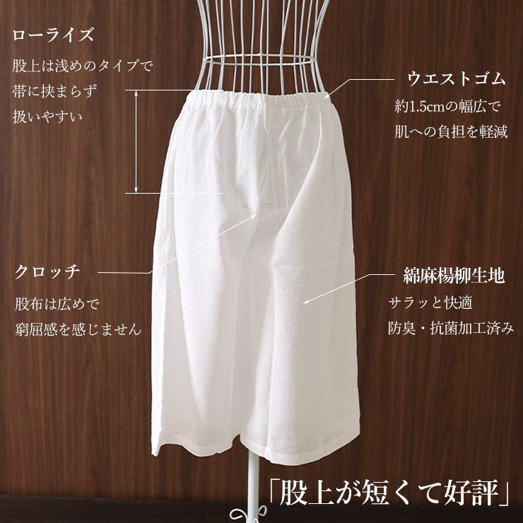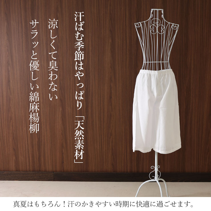日本製 <綿麻楊柳> 新 真夏の女のステテコ ローライズ M L LL 白 綿 麻 防臭 抗菌 下ばき 腹巻 和装肌着 洗濯 しろ シロ ホワイト 単衣 春 夏 秋 (ma509s)