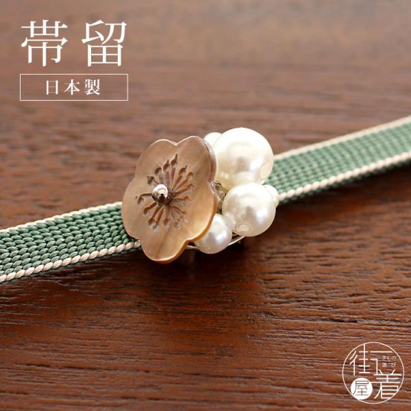 [ 日本製 ] 帯留め 螺鈿 パールに梅(茶 1173-1511-003) うめ パール ラインストーン らでん ラデン ブラウン 帯留 帯どめ 着物 浴衣 花しおり (ma412s)