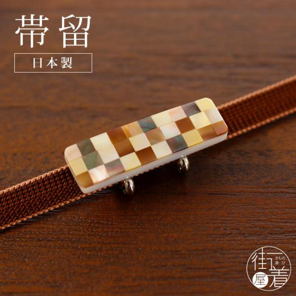 [ 日本製 ] 帯留め 螺鈿 長方形に市松(茶・長方形 1173-1502-002) 市松 四角 ブラウン 古典 伝統 らでん ラデン 帯留 帯どめ 着物 浴衣 花しおり (ma411s)