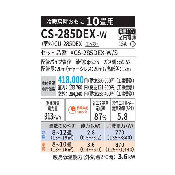 CS-285DEX-W パナソニック エアコン 10畳 EXシリーズ お掃除ロボット 自動排出方式 2025年度モデル 在庫あり 法人様限定販売