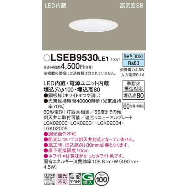 在庫あり LSEB9530LE1 パナソニック 天井埋込型 昼白色 ダウンライト 拡散タイプ 埋込穴φ100 準耐火構造 相当品 LGD1108NLE1 [ LSEB9530 LE1 ]