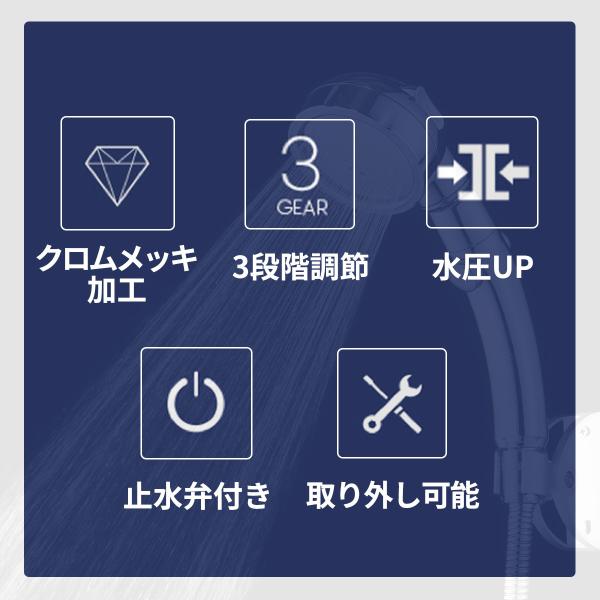 シャワーヘッド 節水 浄水 アダプター付き 水漏れ防止テープ 5m付き 3段階 ストップボタン 高水圧 水圧調整 頭皮 毛穴汚れ 交換フィルター付き 鍍金加工