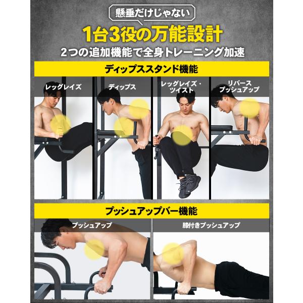 懸垂(チンニング)はもちろん、プッシュアップ、ディップス、レッグレイズなどマルチに鍛えられます。