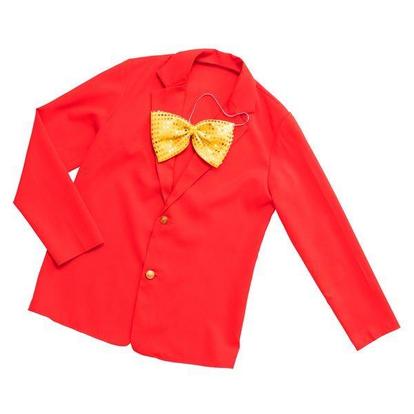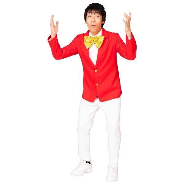 真っ赤なジャケットに、キラキラ光るゴールドの大きな蝶ネクタイが目を引くよ!