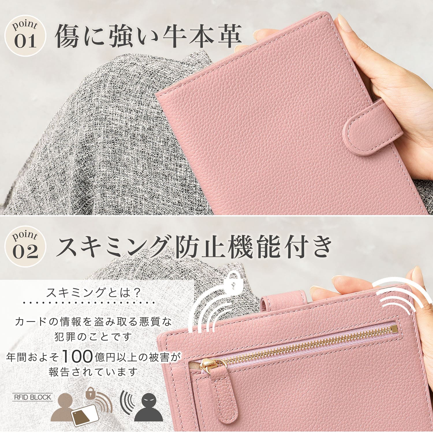 キャッシュレス化が進み、カードでの支払いが日常になった今、便利さの裏で「スキミング」という犯罪のリスクも増えています。スキミングとは、専用機器でクレジットカードやキャッシュカードの情報を盗み取る犯罪で、近づくだけで被害に遭う危険があります。 そんなスキミングからあなたを守るため、特殊フィルムを織り込んだスキミング防止機能を搭載。カードポケットに入れるだけで、外部からの電波をシャットアウトし、大切なカード情報を安全に守ります。
