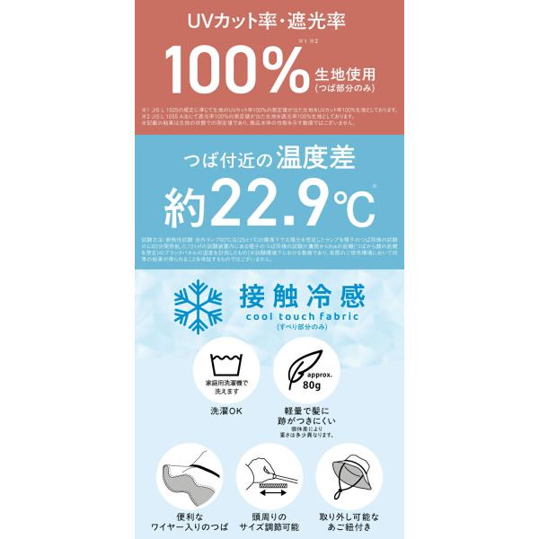 (内側の生地(つば部分)にはUVカット率・遮光率100%・UPF50+の生地を使用)