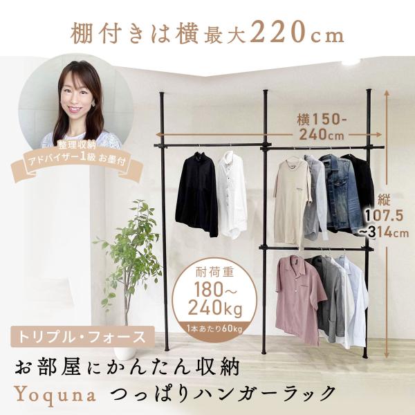 Yoquna ハンガーラック 突っ張り式 トリプル 伸縮 横150-240cm 縦107.5-314cm 耐荷重180kg 洋服ラック つっぱり ランドリー収納 黒 ブラック 白 ホワイト