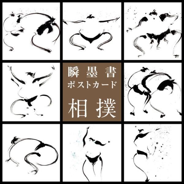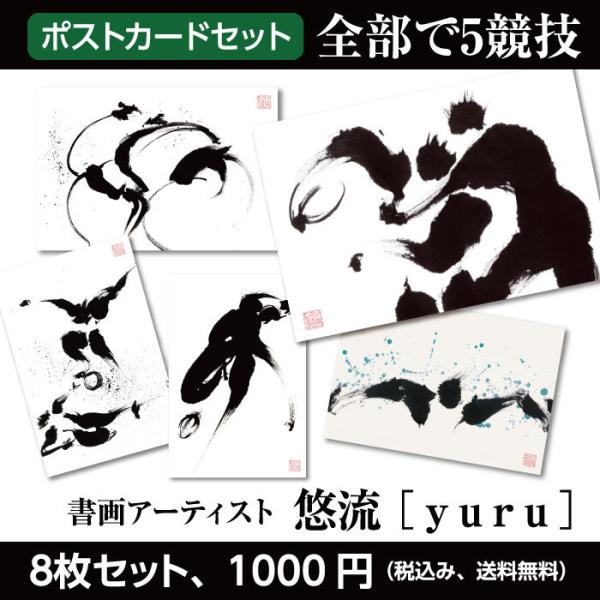 書画アーティスト悠流 「瞬墨書」(水泳、相撲、野球、サッカー、ラグビー)ポストカード 8枚セット 送料無料 墨絵 書画 書道 書 和