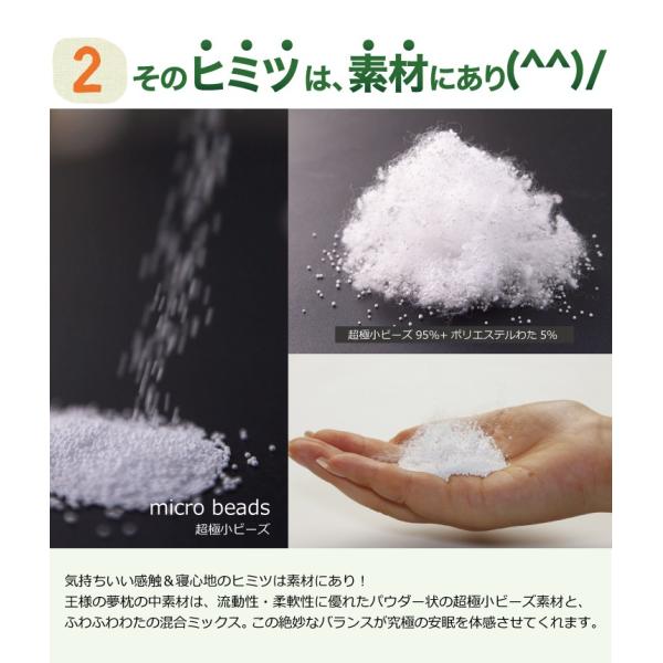 超極小ビーズとボール状のポリエステル綿素材をミックスした枕【王様の夢枕】。超極小ビーズの流動性とポリエステル綿の弾力性の絶妙なバランスにより、気持ちいい寝心地を実現しました。