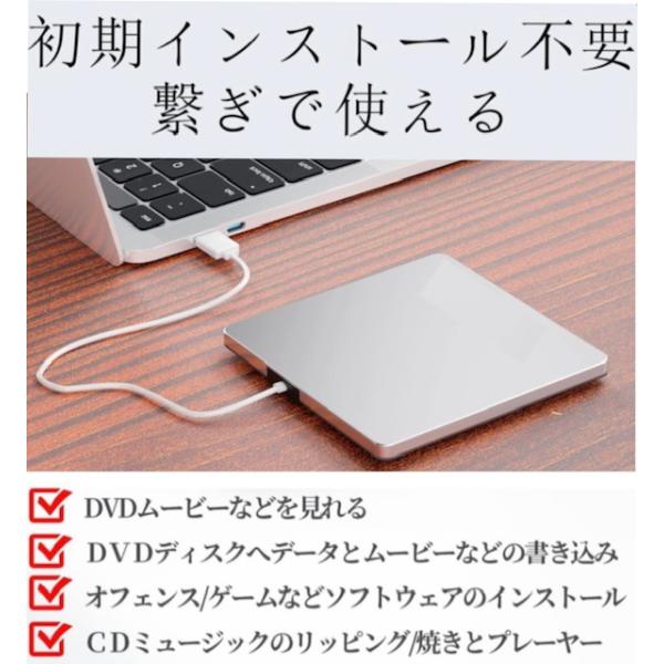 外付けCD DVDドライブNO.1 USB 3.0+Type-CポータブルCD/DVDドライブCD/DVDプレーヤー 再生 プレーヤー読み込み書き込み対応 MAC/window7-11対応 silver
