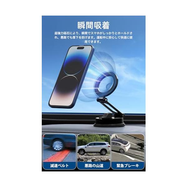 超強力で瞬間吸着:超強力なN52グレードの磁石を採用しており、驚くほどの吸着力を実現します。スマホがしっかりと吸着して固定されます。減速ベルト、悪道などシーンでも使用中の不安定さやスマホの揺れを防ぎ、快適な使用体験を提供できます。瞬間吸着の特性により、簡単かつ素早く取り付けることができるため、運転中に使用する際のストレスが軽減されます。
