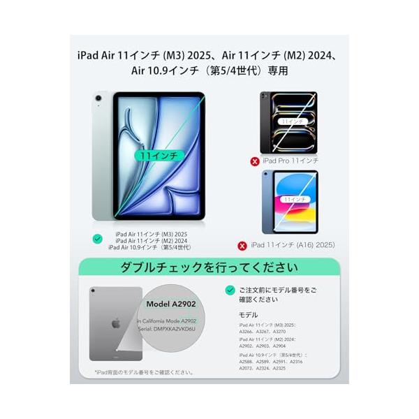 ・互換性:iPad Air 11インチ(M4/M3/M2)2026/2025/2024、iPad Air 10.9インチ(第5/4世代)2022年/2020専用; モデル:A3266、A3267、A3270、A2902、A2903、A2904、A2588、A2589、A2591、A2316、A2324、A2325、A2072