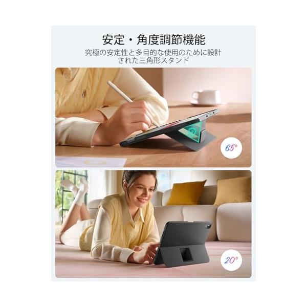 ・【2種類角度調節】:作業や視聴、読書に最適な65度角と、スケッチやライティングに適した20度角を切り替え可能。三角形のサポート構造で安定感抜群、ぐらつきや倒れを防止します。