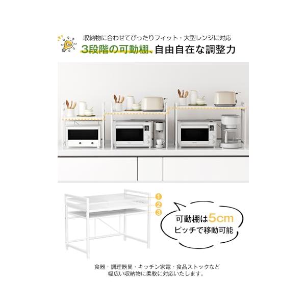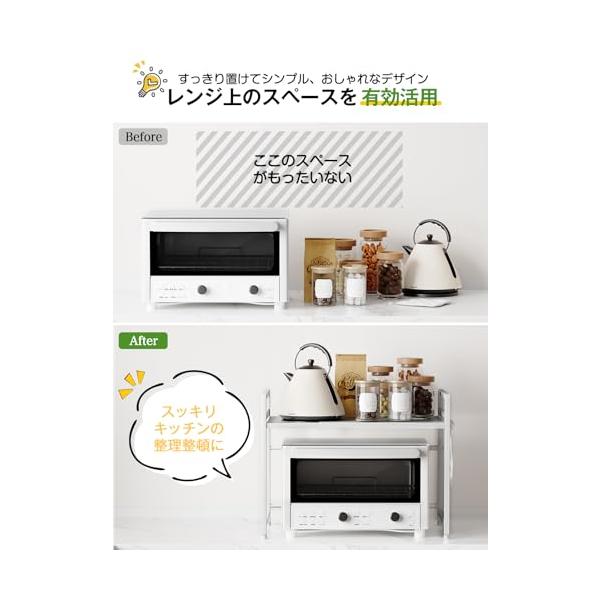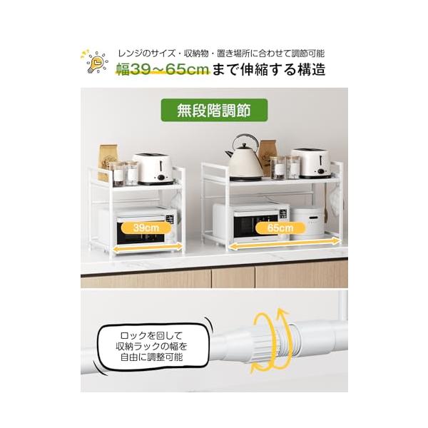 TKUIN レンジ上ラック キッチン 伸縮式 トースターラック 幅 39-65cm 伸縮可 オーブンレンジ 棚板高さ調節可 電子レンジ 台 収