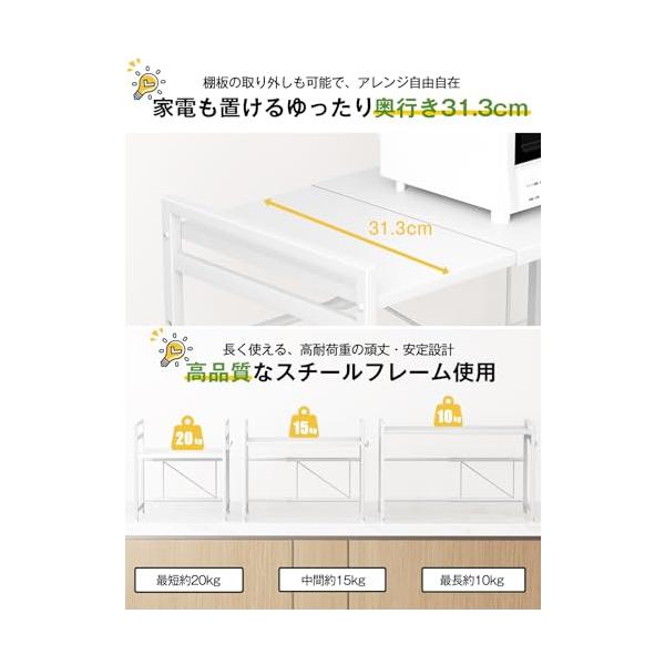 ・【幅伸縮自在&高さ3段調節】収納ラックの幅の伸縮範囲は39cm〜65 cm(外寸)の間で無段階に調節でき、可動棚板は約5cm間隔で3段階で高さ調節可能。電子レンジやオーブン等の小家電に適用し、調味用品、キッチン用品を簡単に綺麗に収納できます。上層の両側は手すり設計を採用し、置物倒れ防止する上、小物を掛けるのに便利なフックが4個付属。キッチンバサミや鍋つかみなどが掛けられます。四つの足の高さも微調整可能で、デスクトップのバランスが崩れている場合は、棚の脚を回転させて高さを調整し、バランスをとることができます。