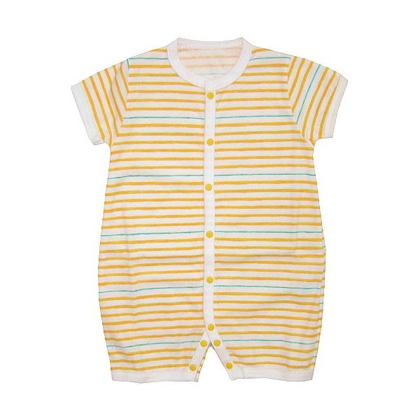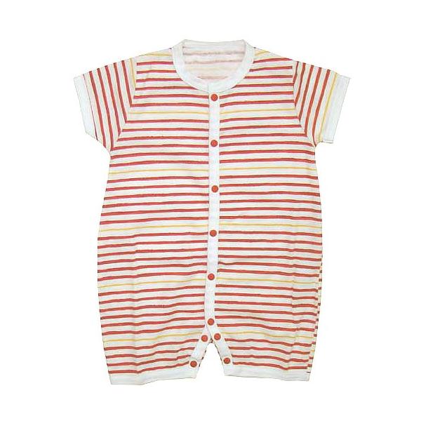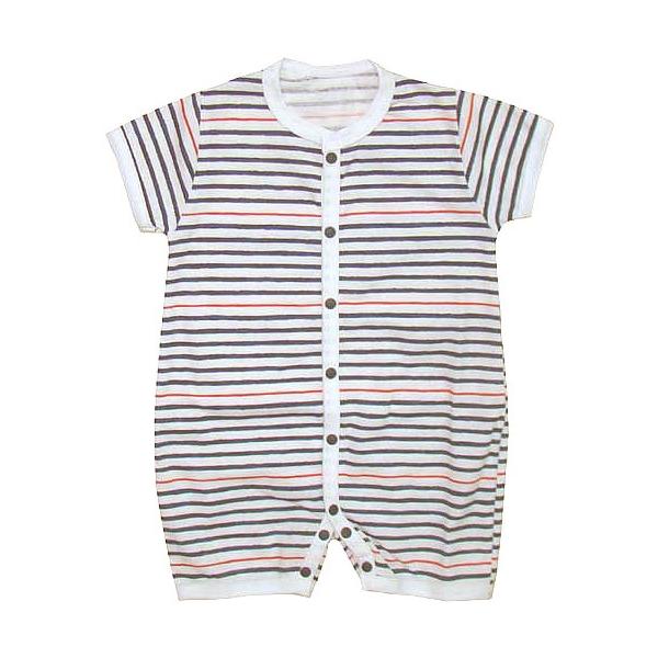 カジュアルなボーダー柄がかわいい、前開タイプの半袖ロンパース。安心の日本製です。