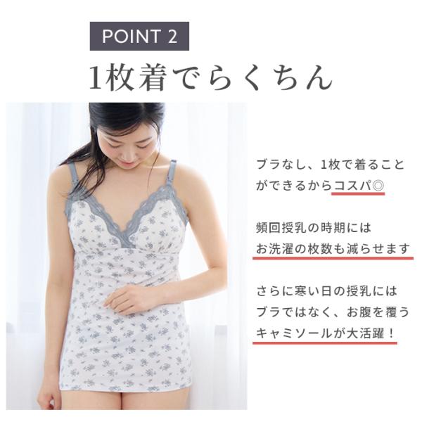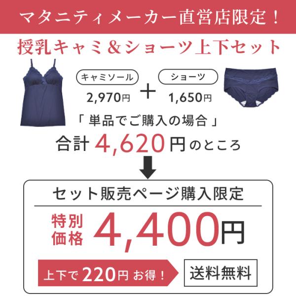 \セットで220円OFF/ 伸縮性の高い天竺素材を使用し、広幅のラッセルレースを贅沢にあしらった授乳キャミとショーツの上下セット。マタニティメーカー直営店限定で単品で購入するよりセットのほうがお買い得です。