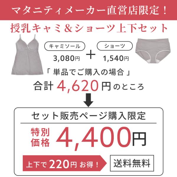 \セットで220円OFF/ マタニティ 肌にやさしい綿ベア天竺を使用した授乳キャミとショーツの上下セット。マタニティメーカー直営店限定で単品で購入するよりセットのほうがお買い得です。