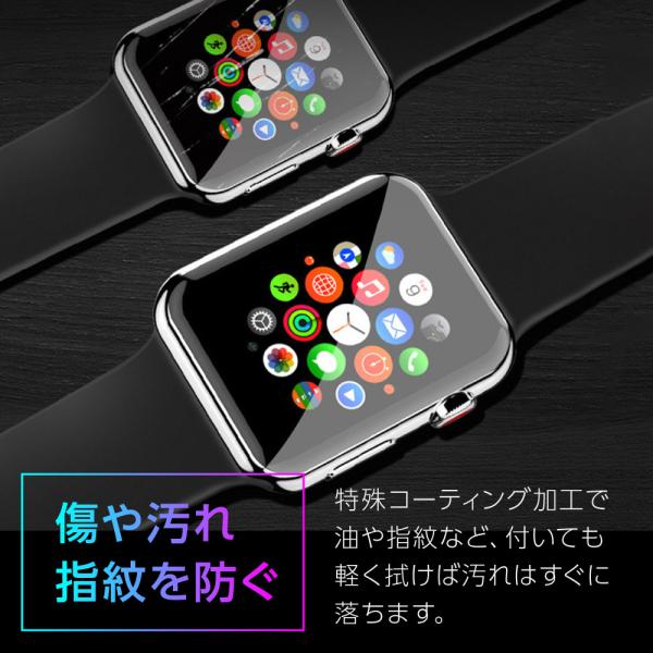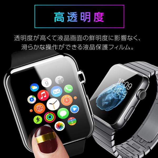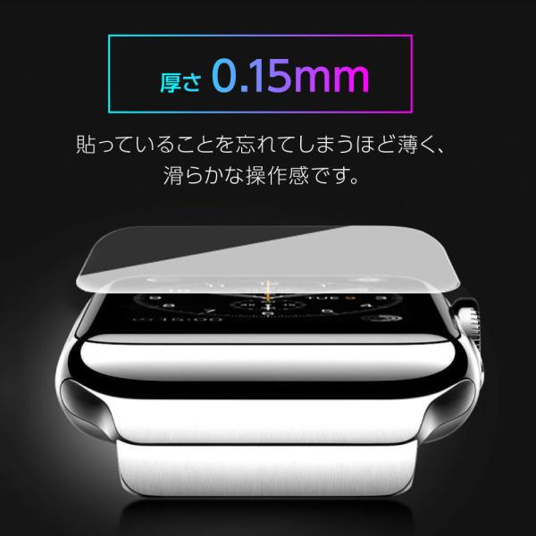 貼っていることを忘れるほどのわずか0.15mmの厚さで透明度が高くて液晶画面の鮮明度に影響なく、滑らかな操作ができる液晶保護フィルム。耐久性に強く柔軟性にも富んだTPU素材で指滑り地もよく、Apple Watch本来の美しさを損なうことなく、ラウンドエッジにピッタリとフィットでしっかり全面保護。特殊コーティング加工で油や指紋など、付いても軽く拭けば汚れはすぐに落ちます。